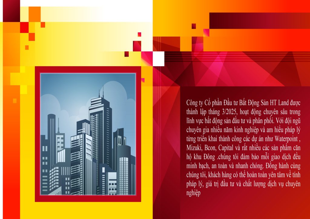 HTLAND là công ty bất động sản hàng đầu, chuyên cung cấp các giải pháp toàn diện trong lĩnh vực đầu tư, phát triển và phân phối bất động sản. Được thành lập với mục tiêu mang đến những sản phẩm chất lượng và dịch vụ vượt trội, HT LAND không ngừng nỗ lực xây dựng uy tín và khẳng định vị thế trong ngành bất động sản Việt Nam.